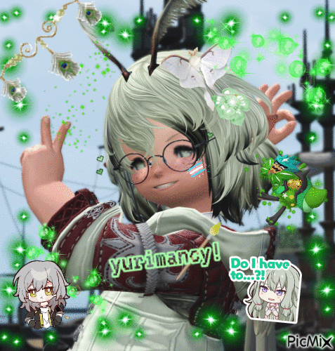 misc stuff after the misc stuff because im weird- haruka, in the events of ffxiv, has gone through 3 jobs. white mage, reaper, and yurimancer pictomancer.- haruka only ever met her mother during the events of dawntrail. she had left very early in haruka's life so she didnt remember her.- haruka is actually. well. kinda? shes not of the source or any of its reflections. shes the daughter of Yadon Kitagya, a character from a story im working on called INTERSPE. this takes place in a place called Unia, the crossroads of the dimensions. Rina, Haruka's mom, is from eorzea. so haruka took it upon herself to explore the realm.- haruka's natural hair color is an ash green with brown scattered through it!- in the events of shadowbringers, haruka lost all ability to use magic, though she was still fully there. she only relearned how to use magic after krile taught her pictomancy.- haruka is looking to become a streamer one day....... though who knows when that'll happen :)
